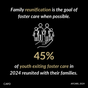 Children can exit foster care for various reasons, including family reunification, adoption, guardianships, or aging out of the system. According to AFCARS, 45% of exits in 2024 were due to reunification, 27% were due to adoption, and 11% were due to guardianship.