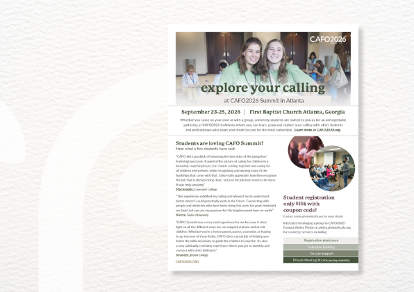 Our annual conference is in Atlanta, GA this year! The CAFO Summit provides opportunities unlike any other for students preparing for a career in social work, cross-cultural ministry, or non-profit leadership to engage with other students and leaders and learn together about serving vulnerable children and families. CAFO provides a highly discounted registration fee and … Read more